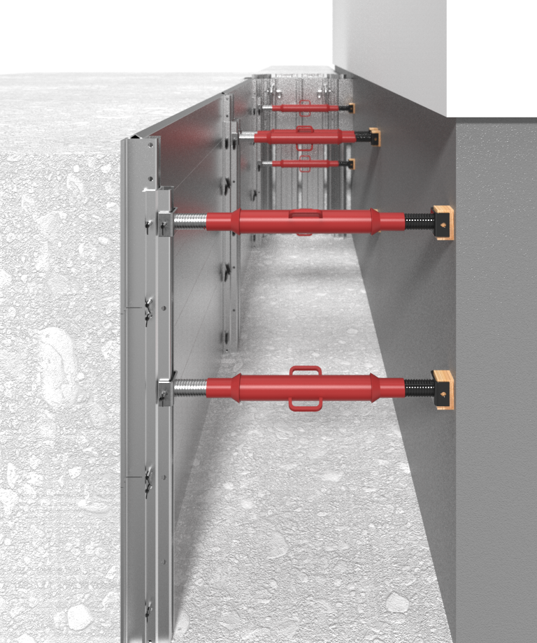 Where buildings or basements have to be waterproofed (where moisture would penetrate from outside, for example), in many cases it is necessary to excavate trenches to allow access to the outer faces of the walls. To ensure safe working in the trenches, systems have to be installed to prevent the soil from collapsing. The shoring system can be propped against the wall so that the soil is held back securely. Normally, building waterproofing measures can only be carried out with very small equipment or by hand. Therefore, the shoring systems chosen must be versatile, adaptable and very easy to use.