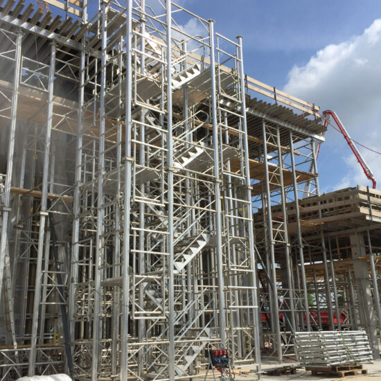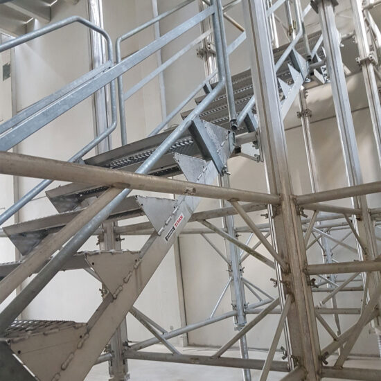 The next step for the aluminium Megashore system: The TITAN aluminium scaffold stair and the access panel with aluminium telescopic ladder both fit into the modular ISCHEBECK TITAN system.
