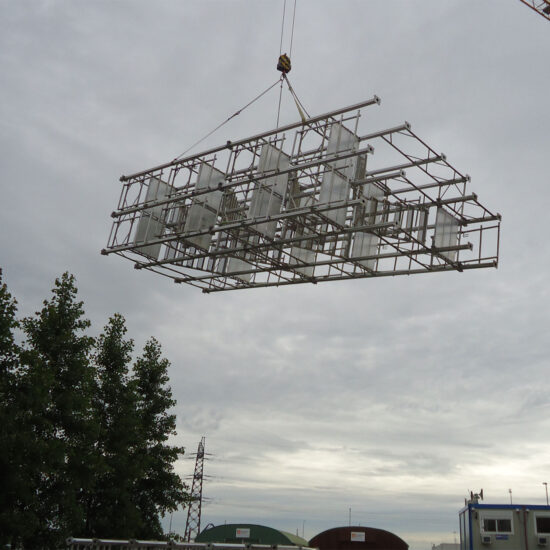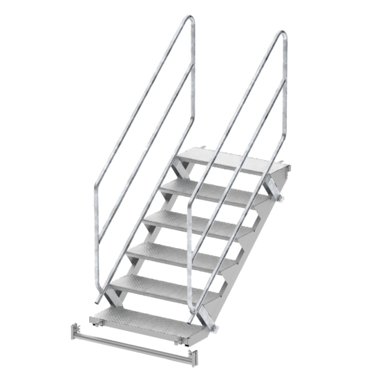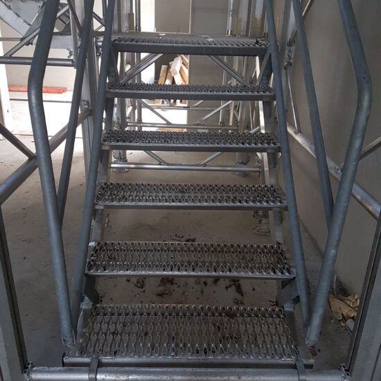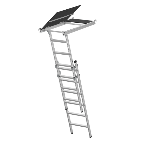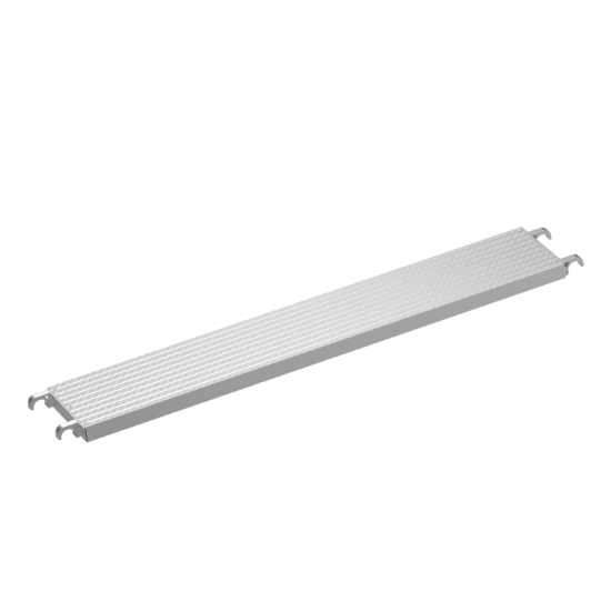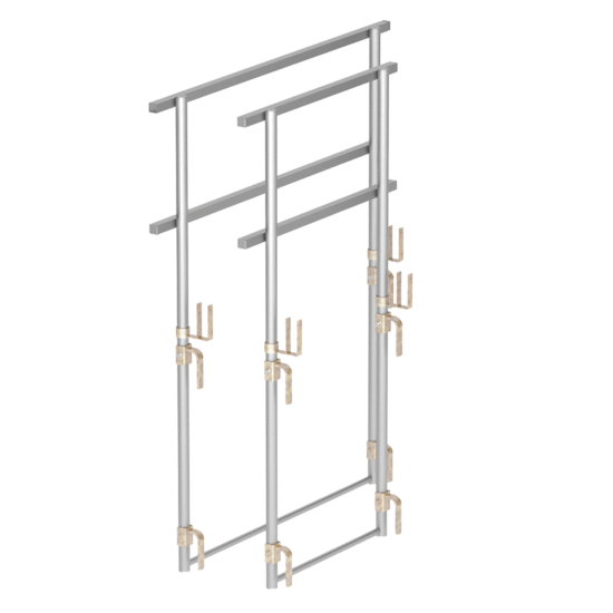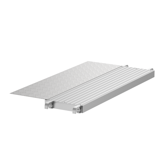 Aluminium scaffold boards and cover boards with a non-slip, profiled surface ensure safe working at heights. The aluminium handrail frame is hooked onto the aluminium ledger frame to ensure safe access.