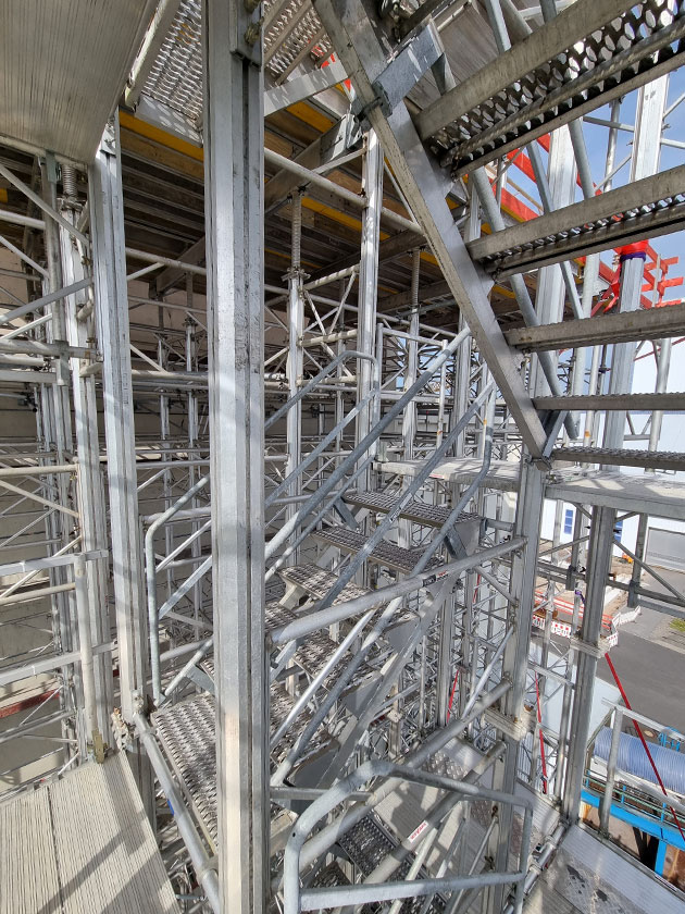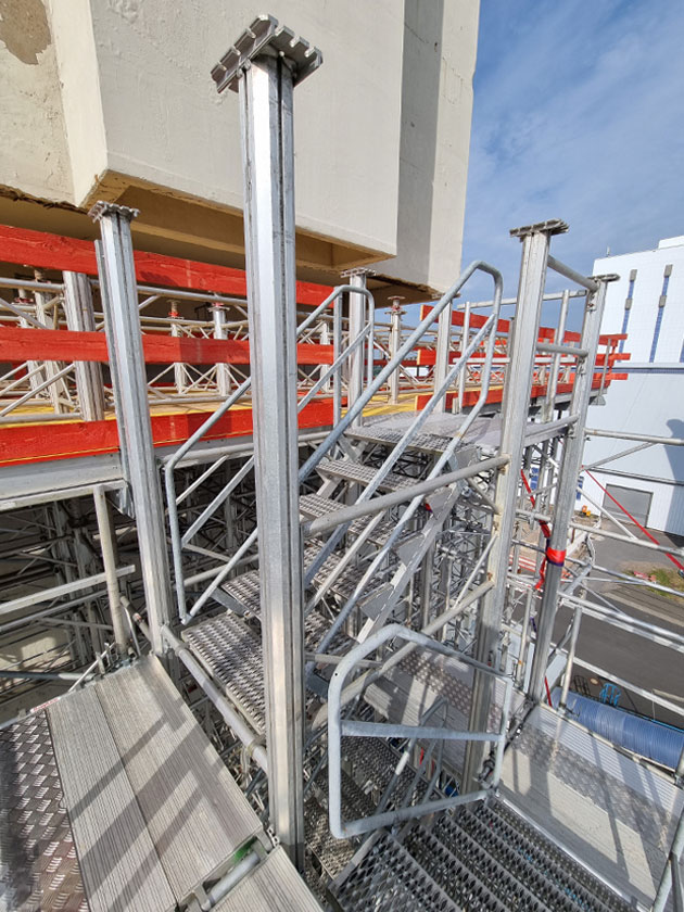 The TITAN aluminium Megashore system offers a stable working platform and reliable support for the formwork during the concreting process. The TITAN aluminium scaffold stair case was also integrated for a safe access to the beam. This is an essential part of the emergency rescue concept.
